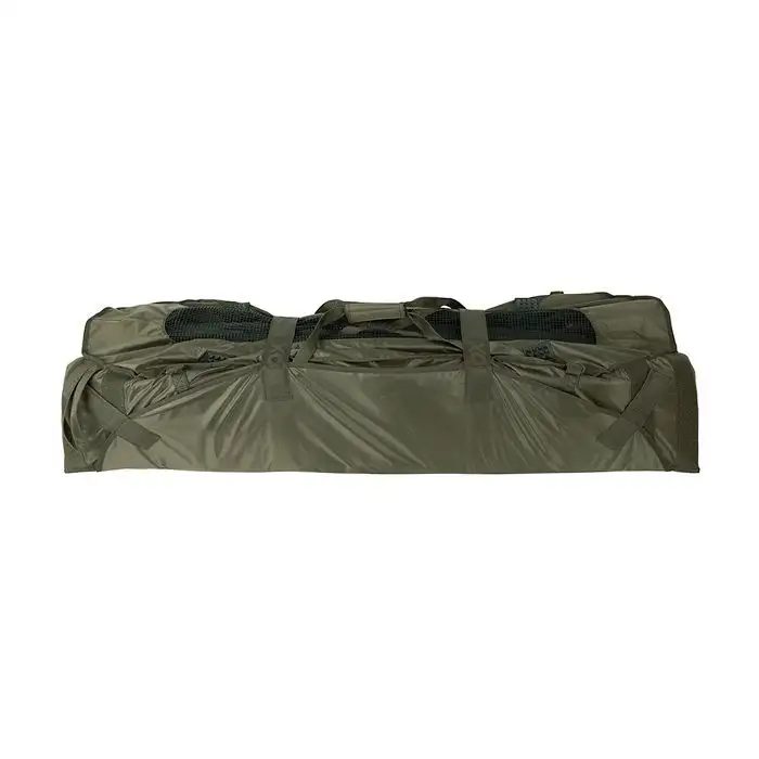 Eine große Reißverschlusstasche zur Aufbewahrung von Karpfenpflegegeräten, Waagen und Wiegeeinrichtungen ist ebenfalls an den hohen Seiten angebracht. Es gibt auch Schlaufen zum Aufhängen und Ösen zum Einhaken, um sicherzustellen, dass sich die Matte bei Windstößen nicht bewegt.